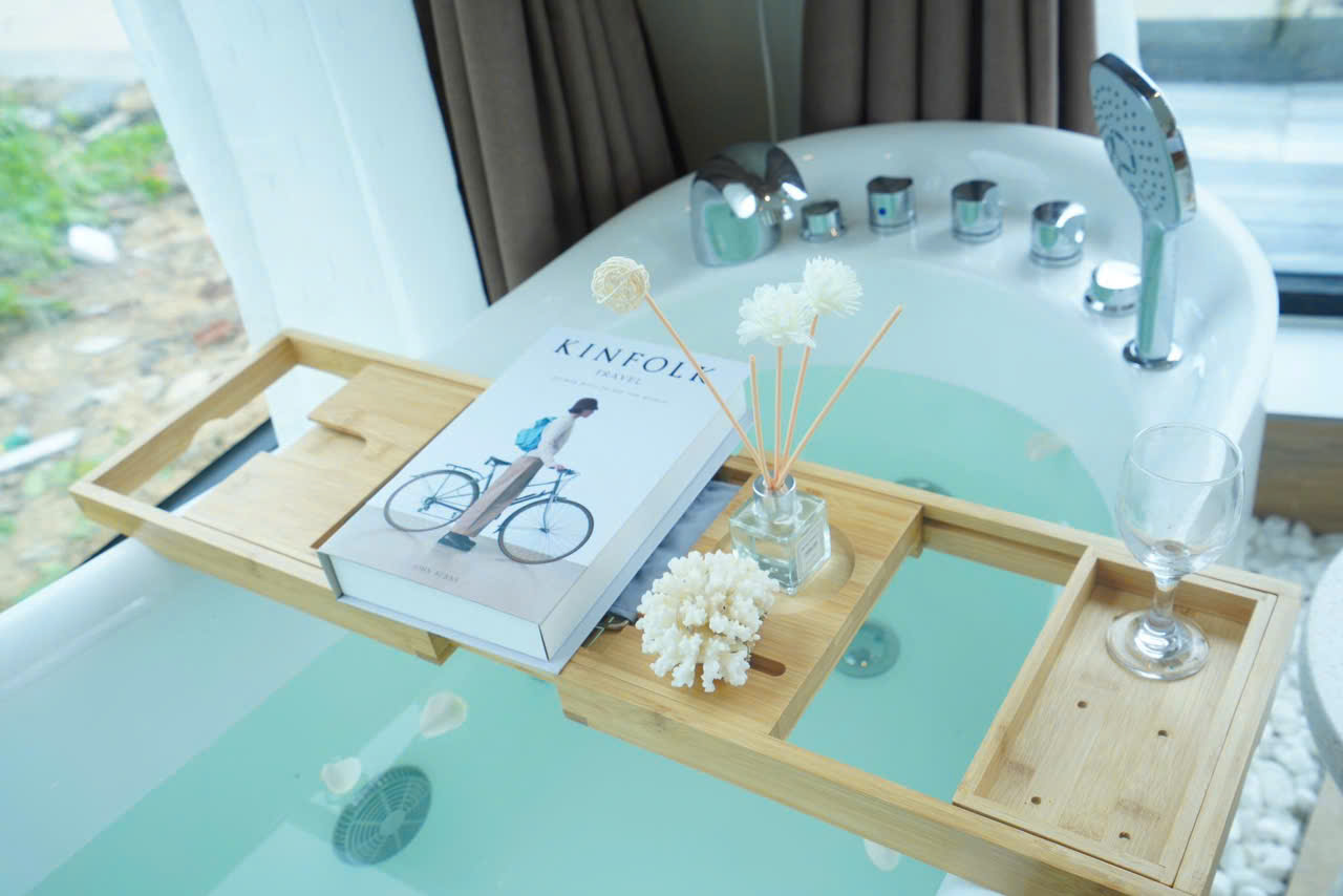 - Bãi biển trong vắt, yên bình với bãi cát dài trắng xoá hình bán nguyệt trước nhà phù hợp với bơi lội, các môn thể thao ở biển như Kayak, ván SUP…